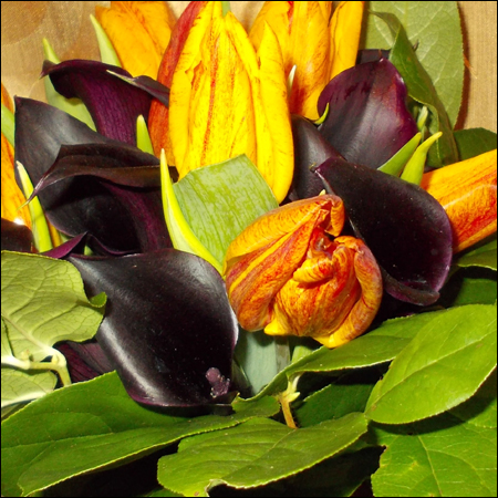А вот и мой букет: обожаемые мною желтые тюльпаны с красными прожилками и необычные черные каллы. И, как ни странно, это был сюрприз. Как и на Новый год. Я не ожидала.