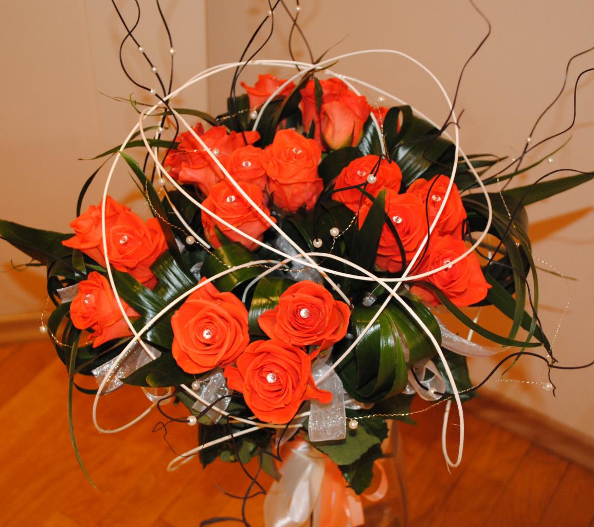 19 роз 80 см, аспедистра, много бантов из органзы, сухие веточки, все в бусинах и стразах на каждом бутоне)