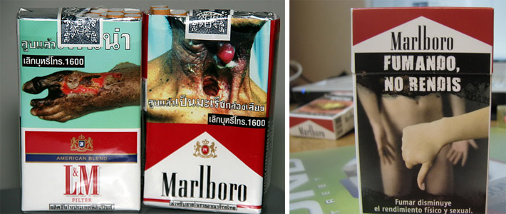 Жалко, что на хлебе, пельменях, колбасе (которые гораздо опаснее ныне, чем сигареты) нет подобной маркировки. Представляю себе предупреждение с соответствующим рисунком на колбасе: "Нитрит натрия - основная причина опухоли мозга и рака двеннадцатиперстной кишки." Или "Клейковина рафинированной муки - одна из причин рака прямой кишки." Да картинок, картинок побольше.