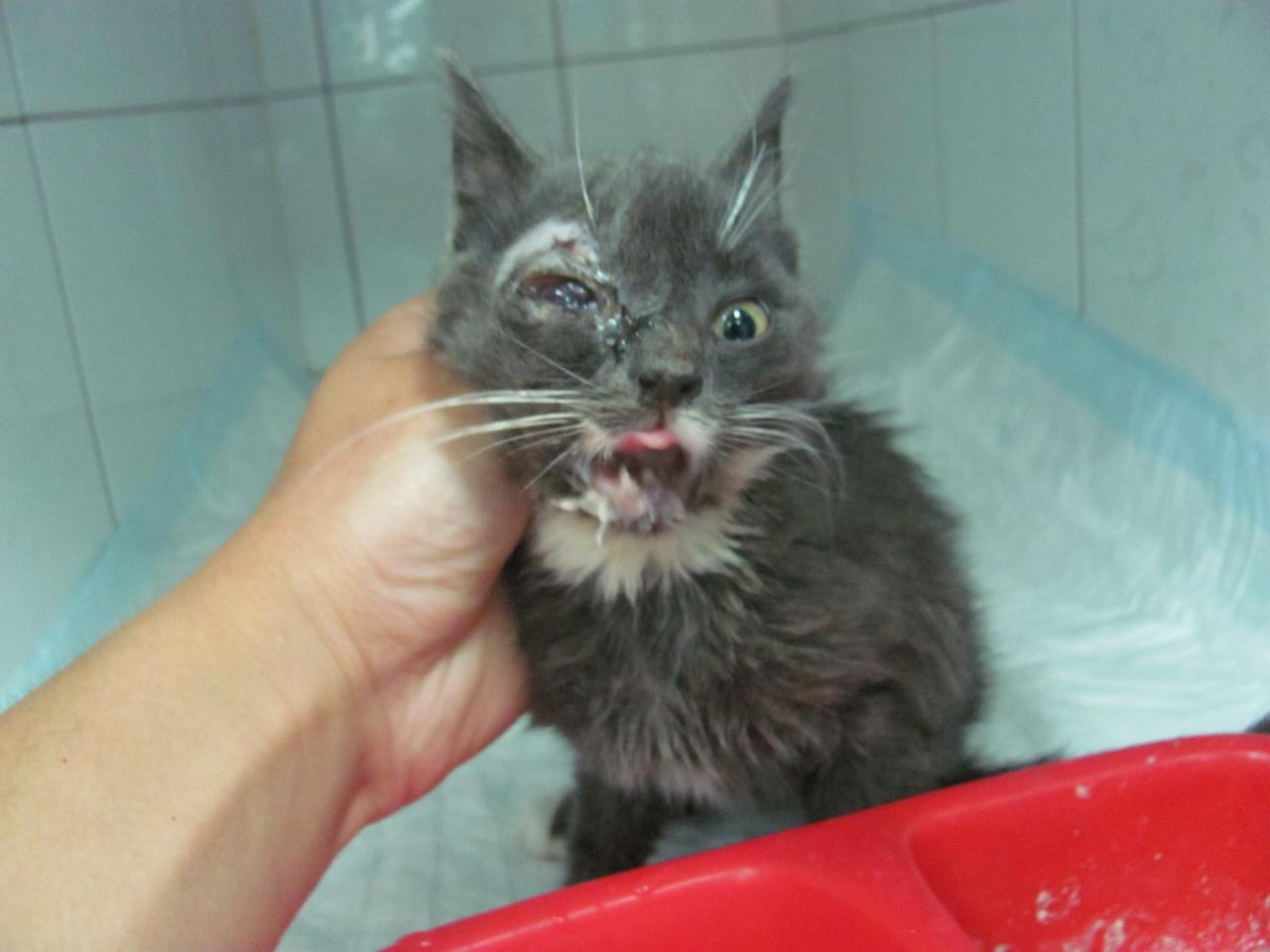 Котенок Мишка попал в клинику недели две назад: коты во время укуса переломали ему челюсть. На нижнюю челюсть наложили конструкцию и она начала заростать. Вчера его принесли снова. Взрослые коты прокусили ему голову возле глаза сверху, а снизу снова проломали челюсть, но уже справа. Владельцы хотят его усыплять. Ищем устройство в хорошие руки котенка после выздоровления.Нажмите на изображение для увеличения