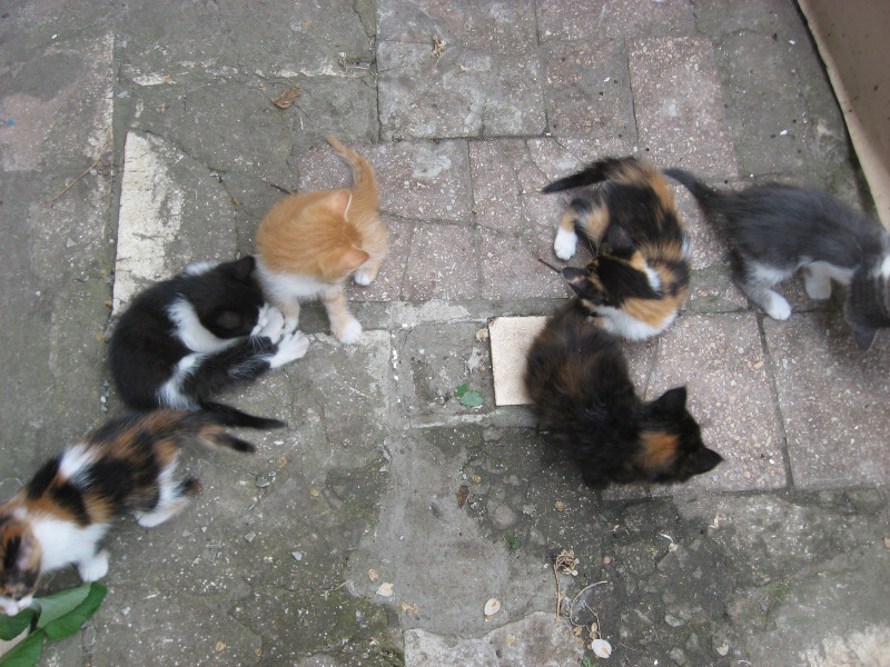 Остались 2 трехцветки, черно-белый, и чумазая. Да и мамочку стерилизовать и пристроить.