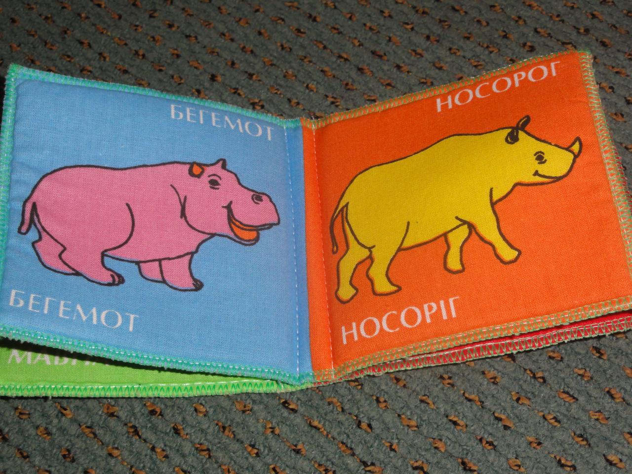 Кроме интересных картинок внимание малыша привлекут торчащие детальки: мягкие на ощупь ушки у жирафчика, листья пальмы из гладкой ткани. А также на страничках есть фактурные аппликации: атласные цветочек и рыбки, мягкие носик и кисточка хвоста у льва.