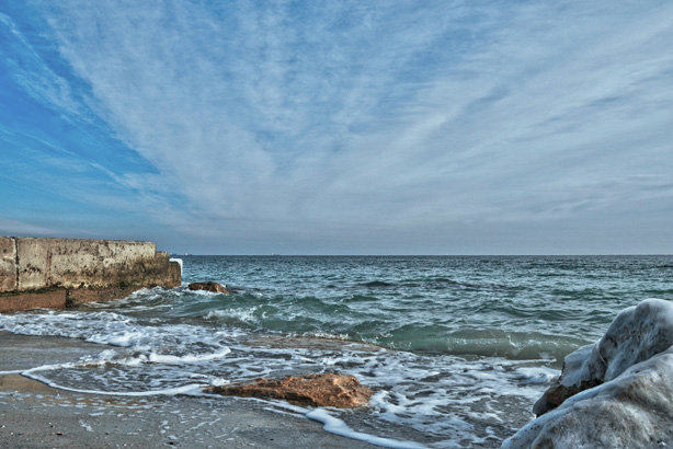 А вот сегодняшнее море. Вроде и холодное, и даже ледок есть, но солнце ласковое, народ млеет.