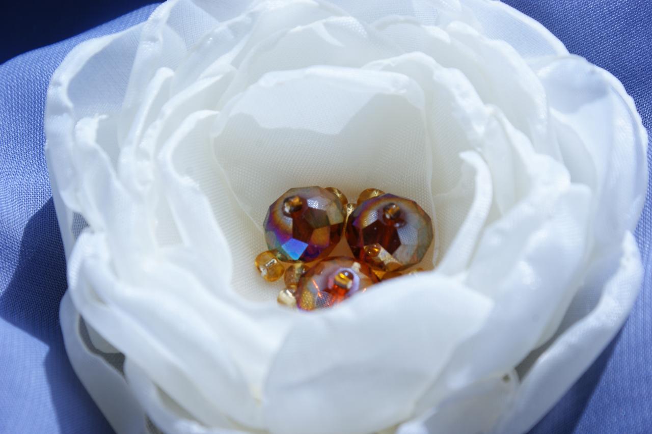 Материал - органза. Серединка - бусины из стекла и бисер. Крепление - 2в1(зажим+брошка) или резиночка для волос. Разме цветка - 8.5-9см. Цена 35грн