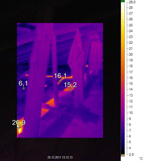 Провели обследования тепловой магистрали здания. Трубы проложены по чердачному помещению. Температура равна температуре улицы, а это около -9С.(снимок зима 2013-2014 гг.) Применение тепловизора позволило быстро оценить состояние теплоизоляции на трубах и ее наличие .