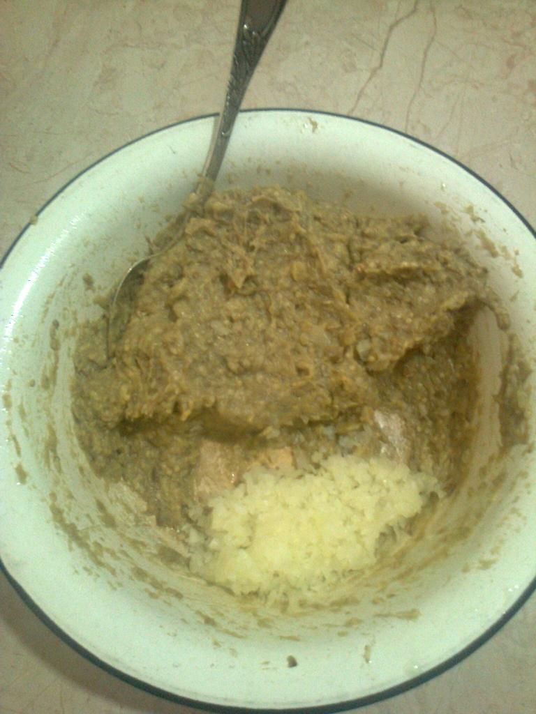 4 шаг – Тщательно вымешиваем синие в миске столовой ложкой постепенно добавляя подсолнечное масло до однородной консистенции, масса должна стать светлой но не жидкой, с ложки падает цельным кусочком, не расплывается. Время вымешивания – не меньше 5 минут, лучше 10. Можно конечно и в блендере, но я делаю ложкой – сила привычки и традиция.