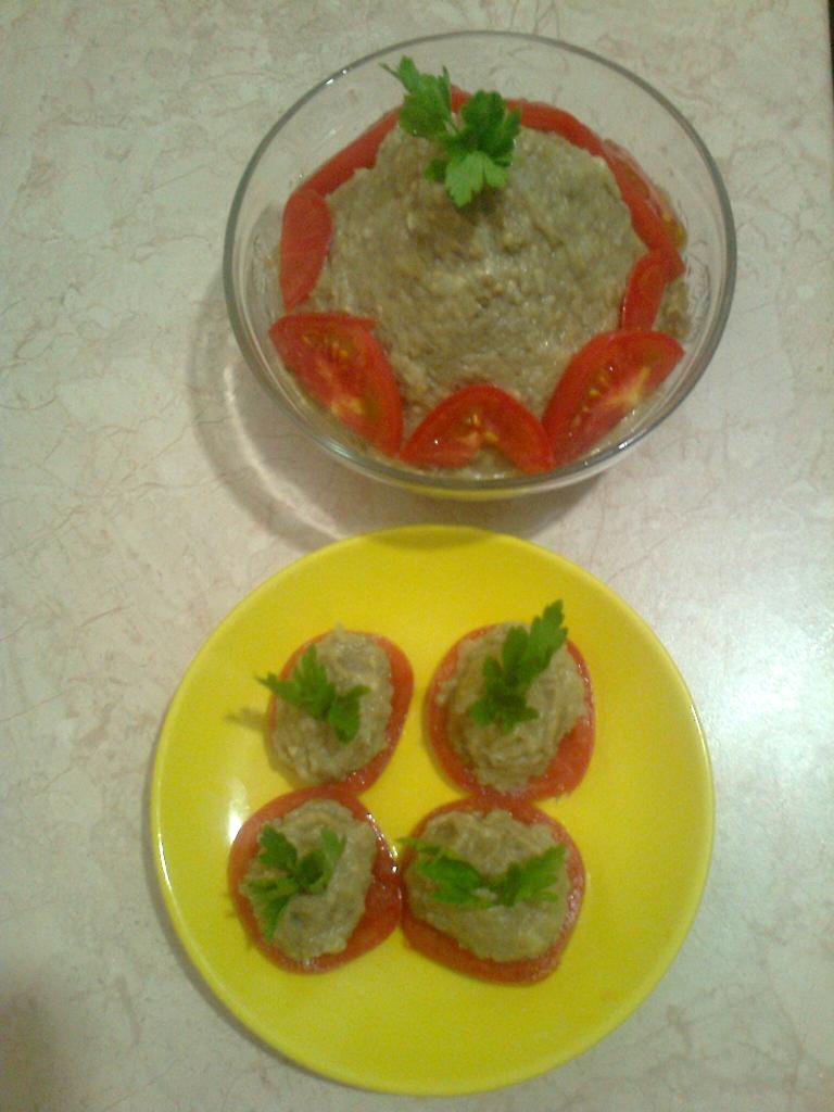 При подаче на стол по периметру вазочки или тарелки с икрой разложить тоненько порезанную полукольцами свежую спелую помидорку. Или на колечко помидорки ложку икры, сверху листик петрушки.