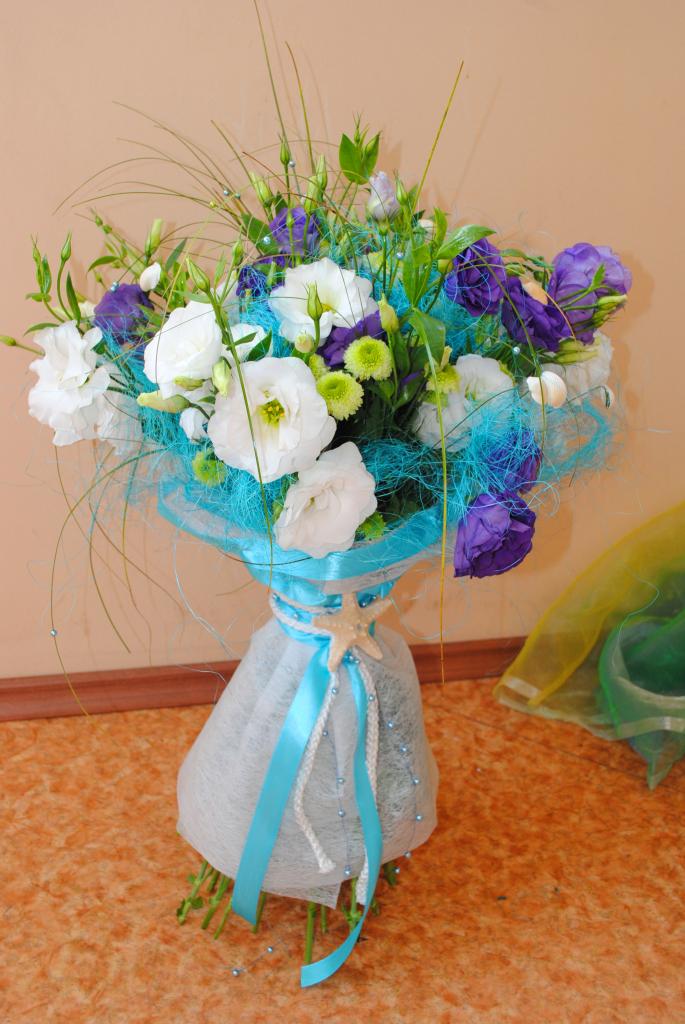 Большой букет из эустомы, зеленой хризантемы, берграсса, декорирован бечевкой, морской звездой, сизалью бирюзовой и ракушками
