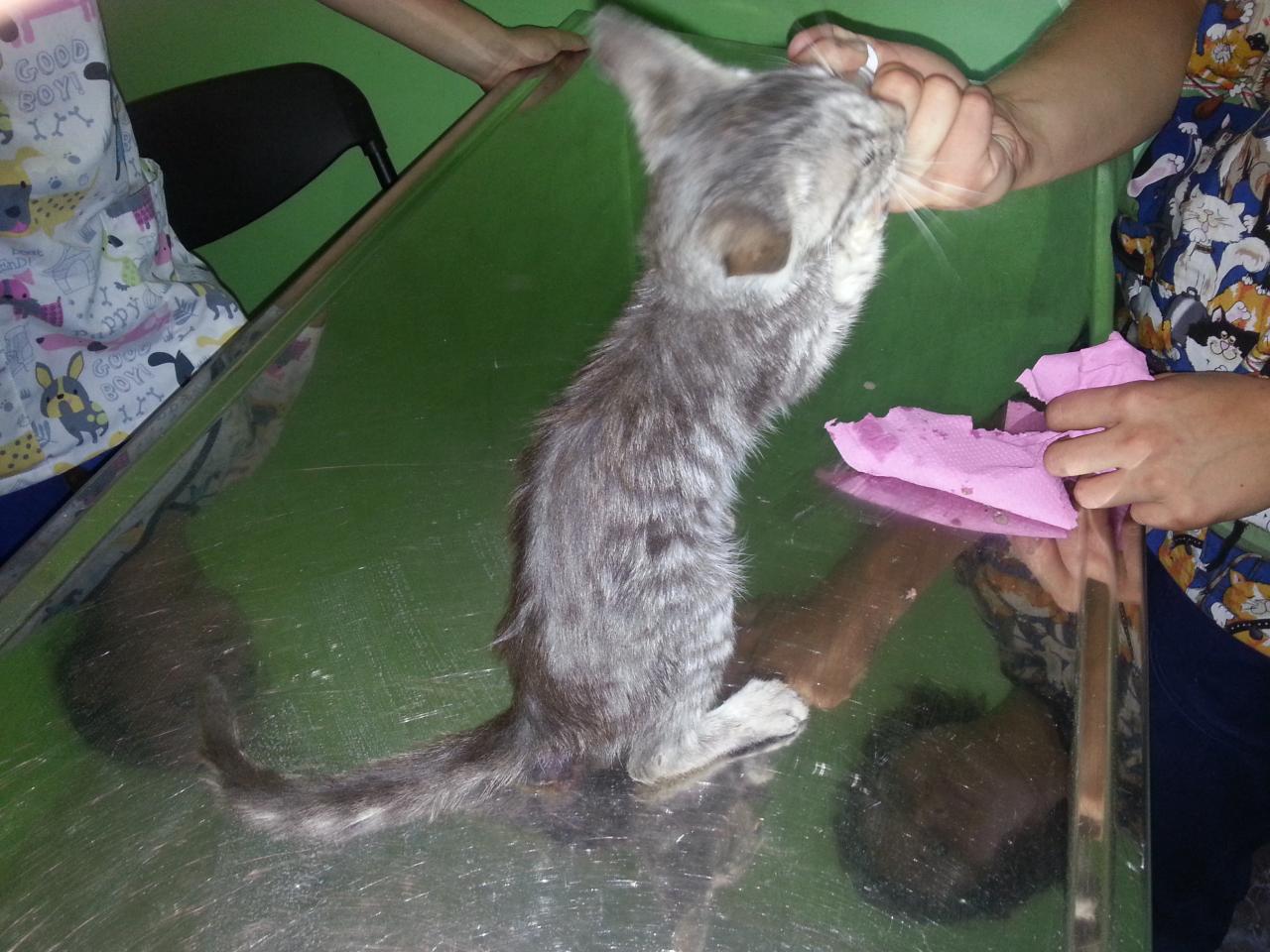 закисшие глазки промыли. нос от засохшей зеленой корки )как он дышал?) тоже почистили, вкололи сыворотку, антибиотик, поставили подкожную капельницу. но все вытекло- очень обезвожен. кожица вся в складку, мышц как буд-то нет, ужасный запах и со рта и с кишечника. не ест, ни пьет...Ночь ,слава богу под лампой переночевал.За вчерашний день уже заплатила 360 гр, сегодня перевезла в Эксвет- спасибо Юле Джулиан за предоставленную скидку.Звонил сейчас врач,состояние назвал тяжелым, взяли кровь на анализ, делают тоже, но капельницы уже делали 3 раза по чуть-чуть.так как из-за сильного обезвоживания шкурочка ничего не держит.Все так же не ест.но анализ не показал чумку, а обнаружили еще многочисленные язвочки во рту,так что все-таки предполагается кальцевироз.После вчерашнего я еще не собрала свои эмоции и чувства в кучу, поэтому ни вчера ни сегодня даже не смогла дать имя котенку...зеленоглазый голубо-полосатенький мальчик. слабо все время плачущий.Врач позвонил и сказал,что ребенок не должен быть без имени и ребята сами в клинике назвали его Сашка- я не против, пусть только выкарабкается! Не было возможности сфотографировать. если кто-то будет в клинике и сможет нашего малыша щелкнуть- буду благодарна.Внесла аванс 200 гр, молюсь...