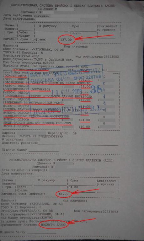 Услуги банка составляют 6%, но не менее 8 грн. И хотя квитанция выдается одна, но оплата этих 137 грн в МРЭО происходит по восьми пунктам: 8 х 8 = 64 грн - все верно.