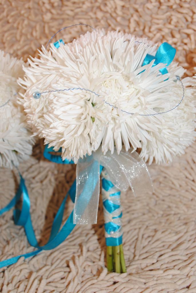 достойный вариант, если нет возможности заказать голубые цветы, заменить их лентами.