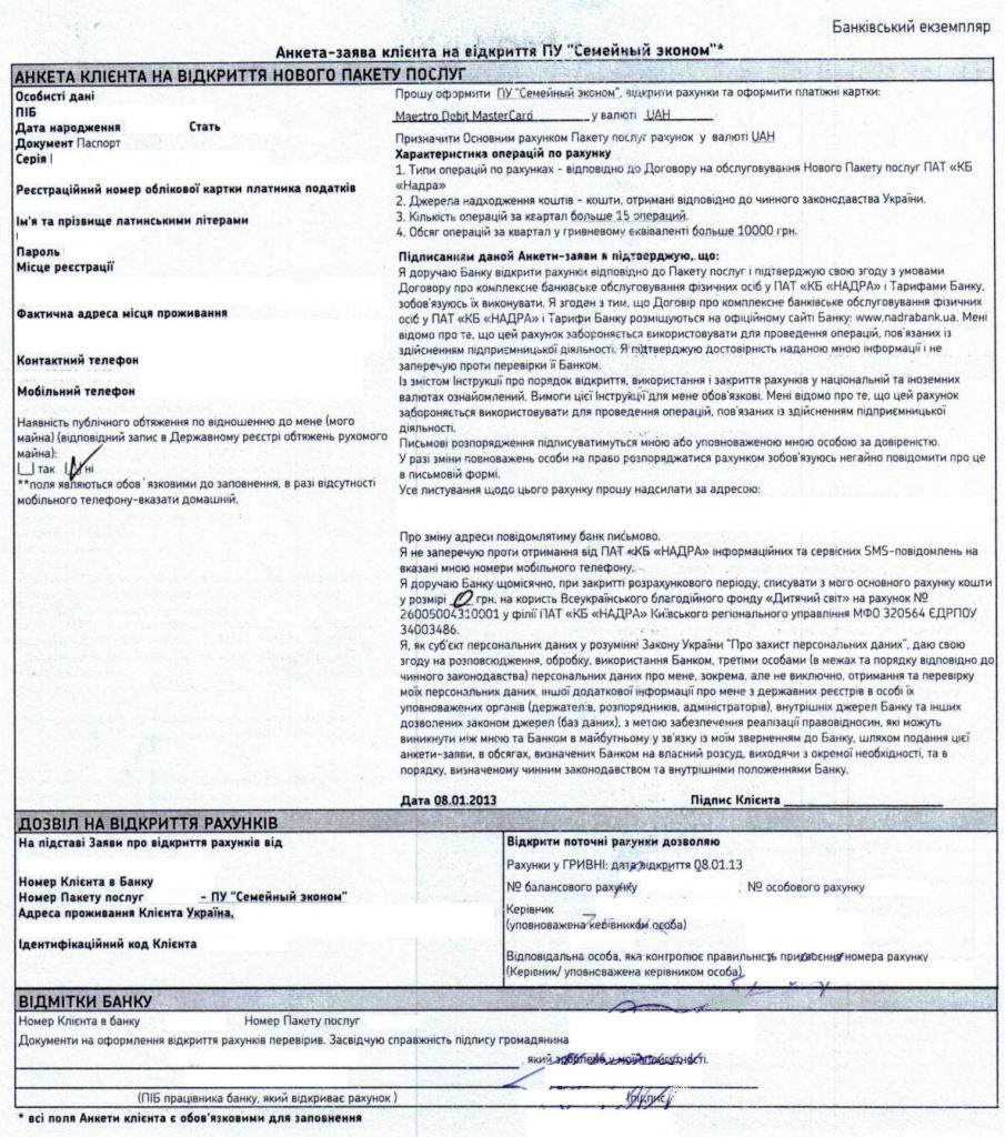 Анкета-заява на открытие пакета услуг была - «Прошу оформити ПУ «Семейный эконом», вiдкрити рахунки та оформити платежнi картки: Maestro Debit Master Card. Как и полагается – «тип операций по счетам –согласно договора на обслуживание Нового пакета услуг», но договор на эту карточку отсутствует. Либо его просто не дали, соответственно и не подписывали, либо действует ранее заключенный, до обмена карточек старого образца на новые «Дебитные». В старом договоре да, есть ссылки на сайт надры, но не слова о кредите! Есть упоминание о овердрафте, но при заполнении прошлой анкеты кажется указывали в ней о том, что от овердрафта отказываешься. При выдачи Дебитной карты, менеджер надры упоминал что овердрафт возможен, но нужно писать заявление.