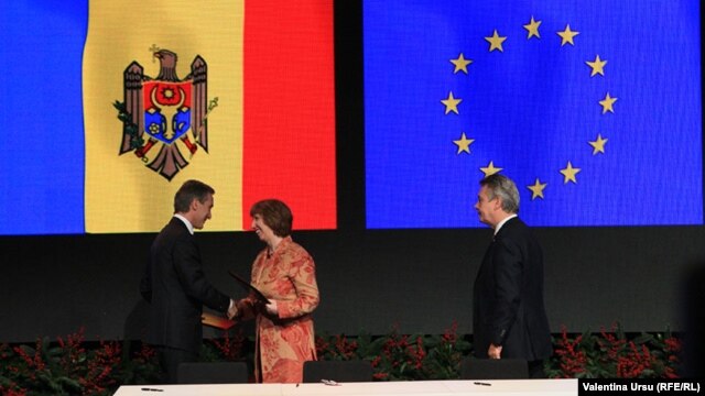 Премьер-министр Молдовы Юрий Лянкэ (слева), комиссар ЕС по внешней политике Кэтрин Эштон (в центре) и комиссар ЕС по торговле Карел де Гюхт на церемонии парафирования соглашения об ассоциации Молдовы с Европейским Союзом. Вильнюс, 29 ноября 2013 года.
