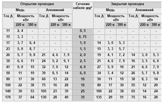 Медный кабель при открытой прокладке держит до 11 кВт.