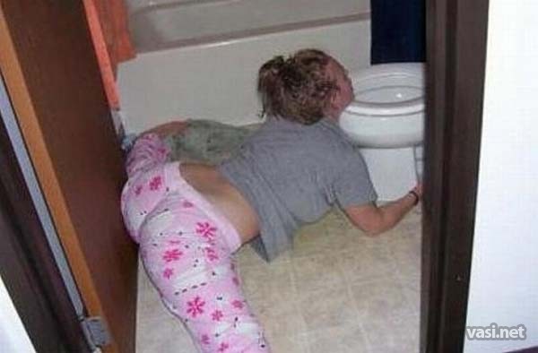 Это непроизвольный шпагат. Она шла блевать, причем уже во второй раз. В первый не полностью попала в цель, вследствие чего на "этом" поскользнулась, ноги разъехались, и еще подбородком треснулась об унитаз. Если присмотреться внимательно, то можно увидеть на лице гримасу боли и отчаяния.