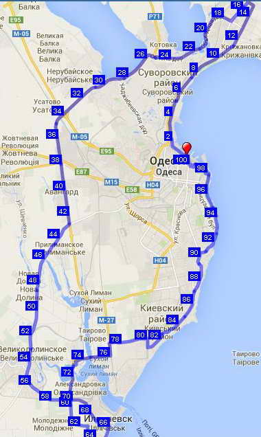 Маршрут как бы не плох, только как на мою точку зрения есть 2-а проблемных участка. От 20 до 30 где маршрут пролегает вдоль Куяльницкого лимана и затем переходит в Хаджибеевский лиман т.е по окружной. Дело в том, там машины по это трассе летают без тормозов