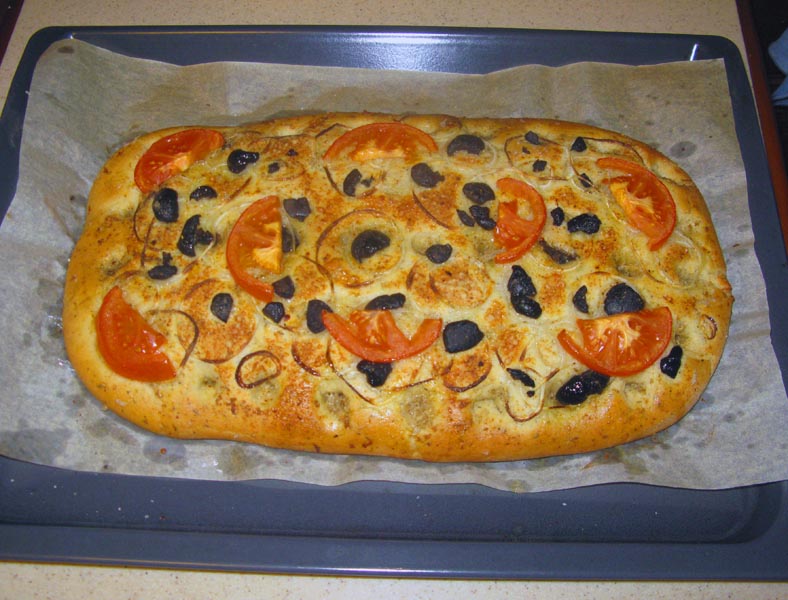 Ну, фокаччо - не совсем пицца. Это итальянская лепешка, древний предок пиццы. У нее богатая и интересная история. Кстати, такого типа лепешки есть во всех кухнях разных народов, ну хоть лаваш к примеру, или французская пита. То, что у нее сверху - это не начинка, это для красоты. Отличается лепешка и от хлеба - один замес, один подъём, выпекли и сразу надо кушать горячую.