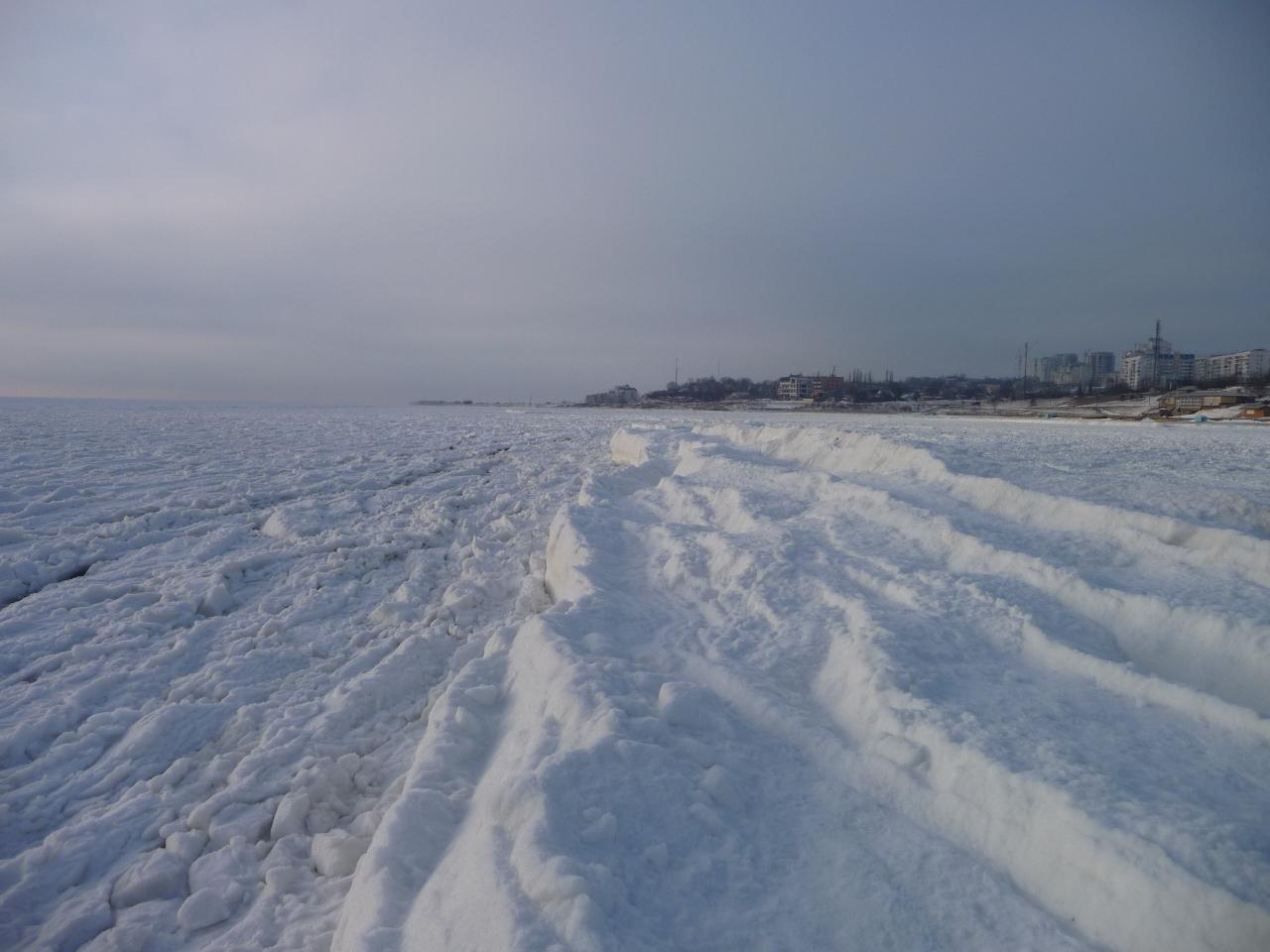 Ланжерон около 8 утра. До волнореза лед. За волнорезом и дальше лед резко переходит в воду, очень прозрачную. Виден каждый камушек и кажется, что очень мелко.