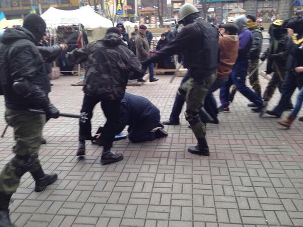 За кілька хвилин співробітників міліції оточили невідомі в масках, касках та з палицями в руках. Спочатку нападники зірвали з кількох правоохоронців погони, потім пошкодили формений одяг. Далі невідомі почали наносити працівникам міліції удари палицями.