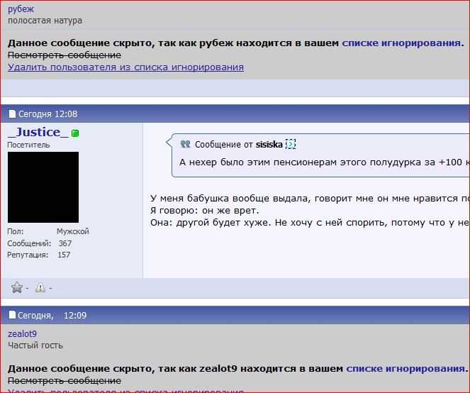 Это что? Я у когось в игноре???? Пипец! Напугали! Мне еще интересно смотреть на минусы, которые мне кидают. Такая злоба в них сквозит, за то что не придерживаюсь их взглядов, то будь их воля, так погрызли б мне шнурки на берцах)))
