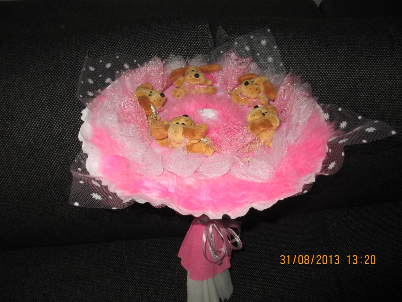Букет из 5 собачек в розовом марабу.Диаметр-30см, высота-40см. Цена-190грн.