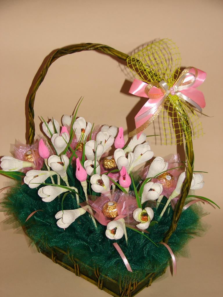 Корзина желто фиолетовых крокусов из конфет"Подарочная"№9