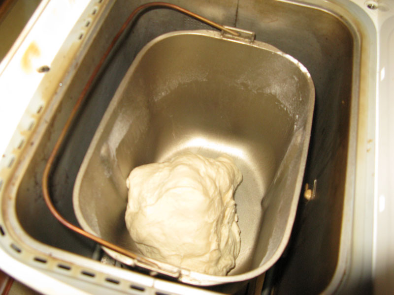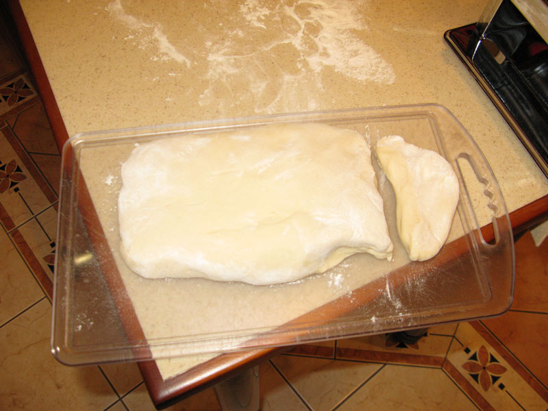 У Панасика есть соответствующая программа, но можно на любой просто мешать 20мин и тесто готово. Бух его на мучной столик и отрезаем первый кусочек: