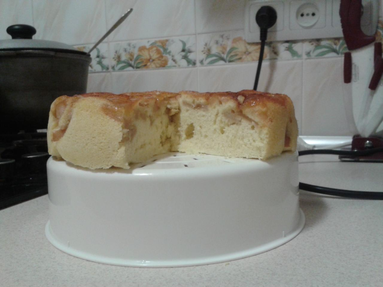 Растопить в МВ 50г сливочного масла и смешать с 1ст.л.сахара до растворения сахара в масле,выложить нарезанные яблоки,залить тестом.