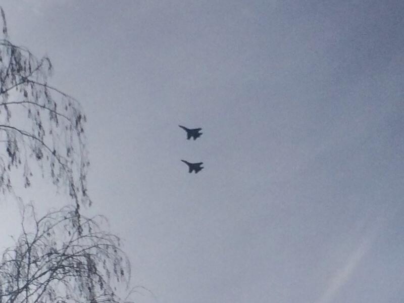 На самом деле это была пара Су-27 - кто интересуется, тот эти машины отличит от МиГов даже мельком взглянув на это харьковское фото из твиттера. Фото на сайте ТСН тоже кликабельно.