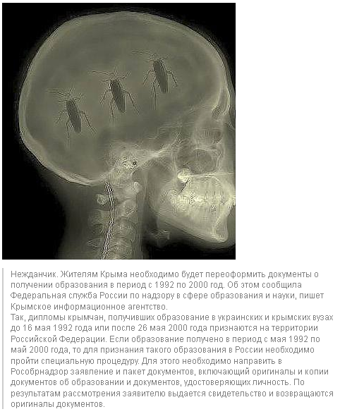 свежак из севастополя. у подружки туда со львова поехала мама. она русская, родилась в россии и очень любила путина. ехала решить вопросы с квартирами. про отказ от российского гражданства даже не заикалась.погуляла по городу и.. решила оставить себе гражданство украины) весь севастополь в российских флагах и картинках украины в колючей проволо е и свастике. народ в глубоком оргазме,что их спасли от фашизма. купить валюту можно ТОЛЬКО в банке по заявлению через две недели после написания заявления. только гривны и рубли. все депозиты в гривнях им дадут по курсу в рублях. когда не известно. пенсию ей дали врублях по курсу,но всем обещают на 25% каждый месяц увеличивать. они и так рады.цены на все поднялись. картошка 28 руб или 9 грн.поезда ходят ТОЛЬКО до 25/05. после этого в крым можно будет приехать по слухам только через россию. самое ржачное))) она купила местную комсомолку крыма. там ей сообщили,что всего 1000 человек на весь крым как и она отказалась от российского гражданства,что скорее всего это бандеровцы и каждым займется фсб. мама в шоке! плачет,что она уже не может любить россию и весь мир рухнул.