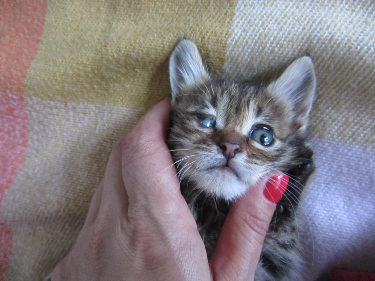 Мое знакомство с котенком произошло еще 28 марта, это была пятница , конец рабочей недели . Меня отпустили пораньше с работы и я пошла домой по другому маршруту . Ну вот , шла шла и нашла .Этот малыш кидался всем прохожим под ноги и кричал изо всех сил , но люди быстро переступали его и шли дальше , ну а я не смогла . Взяла его на руки ,он был весь мокрый , глаза были залипшие в гное , с носа текло. Завернула его в носовой платочек ,и бегом побежала в Эксвет. В клинике сказали, что нам 4 недельки ) , весил он 300 грамм. назначили лечение и в целях экономии я забрала его домой. Сам он не кушал , выкармливала со шприца . За все это время я возила его еще к трем разным врачам на консультации , были мы и у Морозова . Нам поставили диагноз -симблефарон , это сращение конъюнктивы век с конъюнктивой глазного яблока, нужна операция. Но проблема в том , что пока нам еще надо подрасти и набраться силы для такой операции. С самого первого дня меня морально поддерживали himeraod и oksana-1965 , спасибо вам , девочки . Думала осилю сама все материальные расходы , но не получается. Очень прошу финансовой помощи в сборе денег на операцию . Мы с Вилей будем вам очень благодарны.
