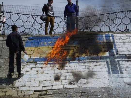 Отважные "Ночные шавки" так боятся флага Украины)) Что готовы его выжигать и вытирать вместе с камнем.