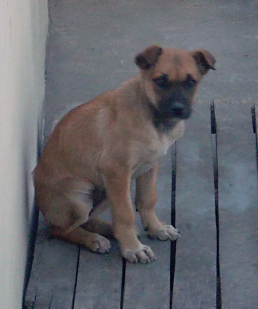 Этот щенок, похож на боксера, сидел очень грустный.