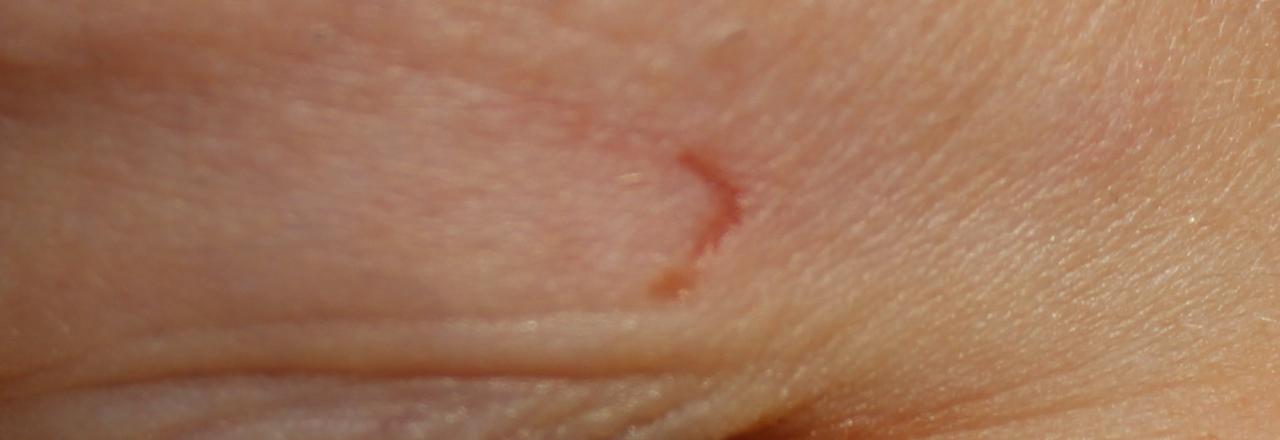 Главное не сдирать корочку, шрамик получиться, сама должна отпасть. Красное пятнышко будет долго, главное не на солнце, У меня на виске месяца два краснота сходила.