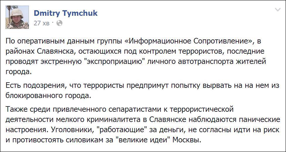 8:34 По оперативным данным группы «Информационное Сопротивление», в районах Славянска, остающихся под контролем террористов, последние проводят экстренную "экспроприацию" личного автотранспорта жителей города.