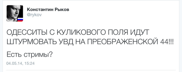 P.S. И я прошу вас, друзья, не называйте погибших в Одессе ребят "одесской сотней". Пожалуйста, не надо. Они не заслужили, чтобы к ним приклеилось это позорное майдановское погоняло. "Небесная сотня" - это фальшивый, трижды купленный и десятеро проданный миф, как бандера и шухевич. Не позорьте отважных 38 ребят-одесситов даже намёком на подонков майдана."