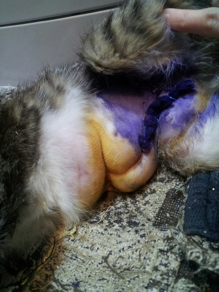 Но буквально с месяц назад, съезжают ещё одни.... И в коридоре мечется абсолютно перепуганное , шугающаяся каждого звука существо. Тогда мне показалось, что это котенок месяцев 3-х. Начала по тихоньку подкармливать. Через неделю она начала подходить уже к руке. Через 2 дала себя гладить, на третьей неделе я взяла её на руки. И тогда я нащупала какие-то уплотнения на груди... Особого внимания не предала, но вот проходит неделя, девочка становится похожа на шарик....Полностью опухли все молочные железы...Понимая, что тянуть дальше некуда, несу её в клинику. Ей поставили диагноз "ювенильная гиперплазия молочных желёз" и лечение. А вот лечение, к сожалению я не потяну... Народ, прошу у вас помощи!