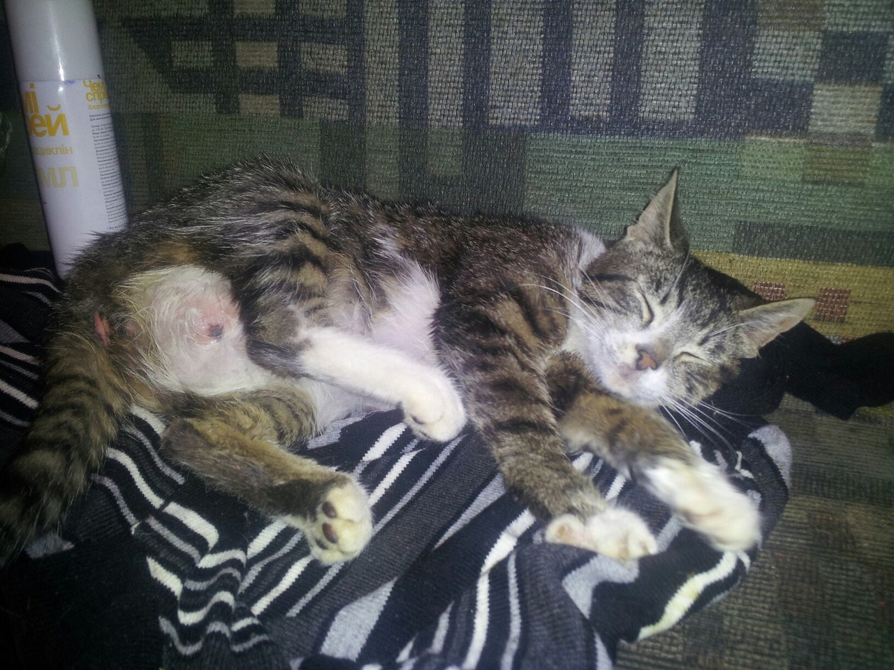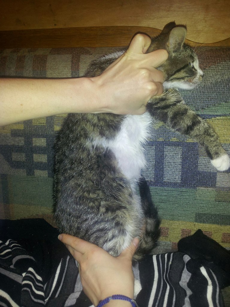 Но буквально с месяц назад, съезжают ещё одни.... И в коридоре мечется абсолютно перепуганное , шугающаяся каждого звука существо. Тогда мне показалось, что это котенок месяцев 3-х. Начала по тихоньку подкармливать. Через неделю она начала подходить уже к руке. Через 2 дала себя гладить, на третьей неделе я взяла её на руки. И тогда я нащупала какие-то уплотнения на груди... Особого внимания не предала, но вот проходит неделя, девочка становится похожа на шарик....Полностью опухли все молочные железы...Понимая, что тянуть дальше некуда, несу её в клинику. Ей поставили диагноз "ювенильная гиперплазия молочных желёз" и лечение. А вот лечение, к сожалению я не потяну... Народ, прошу у вас помощи!