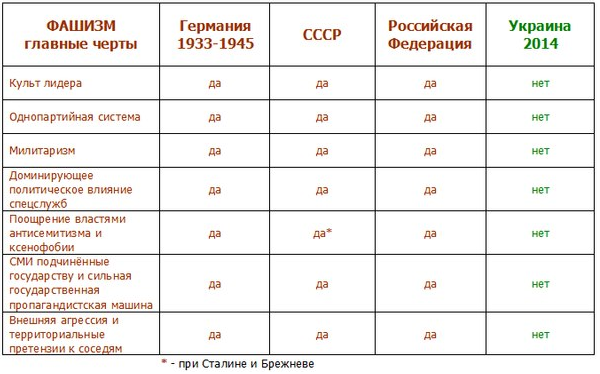 в Украине 2014 культа лидера нет , только по причине отсутствия такой личности , а однопартийная система , милитаризм и остальные черты присутствуют в избытке