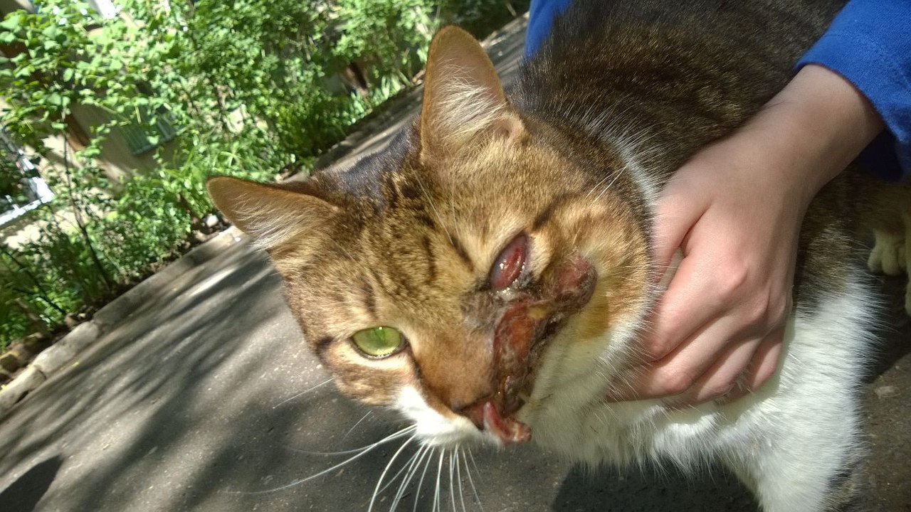 Доброе утро, на улице увидела кошку, давно в этом дворе живёт, видимо сидела под колесом машины, и на нее наехали, челюсть верхняя смята, части нет, травмирован глаз!!! Раны не свежие, немного затянулись. что делать,звонила в аиболит, сказали операция от 1000 грн. сама не справлюсь,домой не могу взять!!!!!!!!!!!!!!!! ПОМОГИТЕ!
