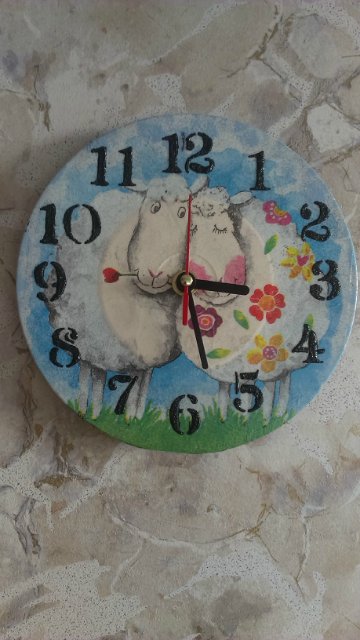 вот такие "Милые влюбленные Овечки" получились у меня в этот раз. Часики получились маленькими, но симпатишными. Диаметр 18 см, безшумный ход. Так что детку не разбудят.