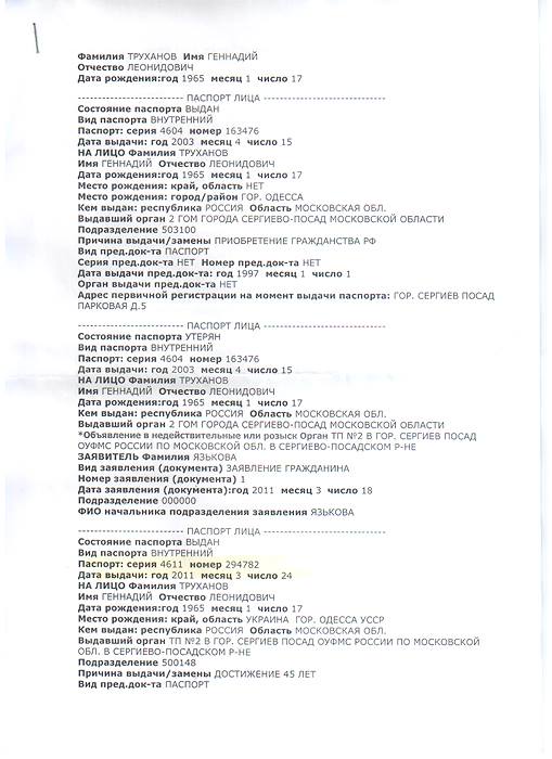 Наявні офіційні дані свідчать про те, що Труханов Генадій Леонідович, 1965 р. народження, має і другий дійсний паспорт громадянина РФ: серія 4611 №294782 з пропискою в м. Сергіїв-Посад (Московська область), виданий, у зв’язку із досягненням 45 років, 24 березня 2011 р. Даний паспорт був отриманий взамін паспорта: серія 4604 №163476, виданого Труханову Г.Л. в м. Сергіїв-Посад 15 квітня 2003 р., у зв’язку з отриманням громадянства РФ.