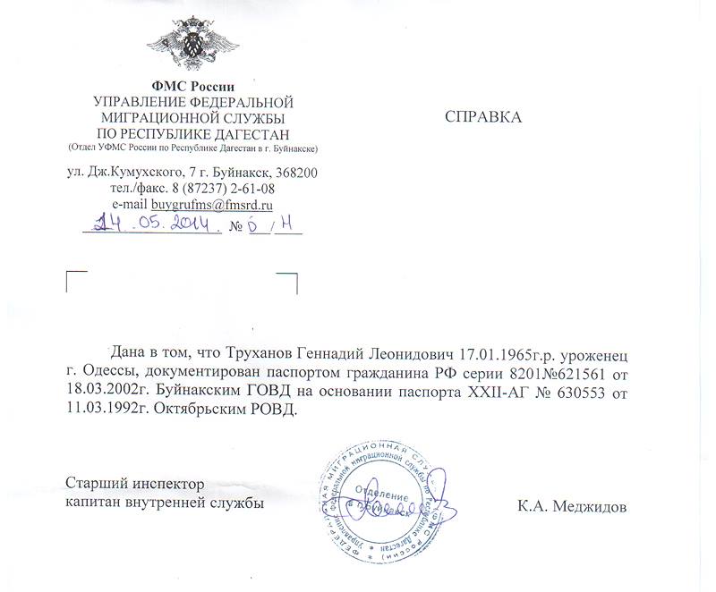 За офіційними даними Федеральної міграційної служби Росії, уродженець міста Одеси, Труханов Генадій Леонідович, 1965 р. народження є власником паспорту громадянина РФ серія 8201 №621561 з пропискою в м. Буйнакск (Республіка Дагестан). Паспорт виданий Буйнакським міським відділом внутрішніх справ на основі паспорта серії XXII – АГ №630553 від 11.03.1992 р. отриманого в свою чергу у зв’язку з звільненням в запас із рядів збройних сил РФ. Службу Труханов Г.Л. з 1986 по 1992 р. проходив в Північно-Кавказькому військовому окрузі.