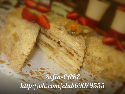 Наполеон- от 60 гривен за килограмм(коржи из слоёного теста, ванильно заварной крем или шоколадный заварной крем, пропитка абрикосовым джемом, просыпка грецкими орехами)