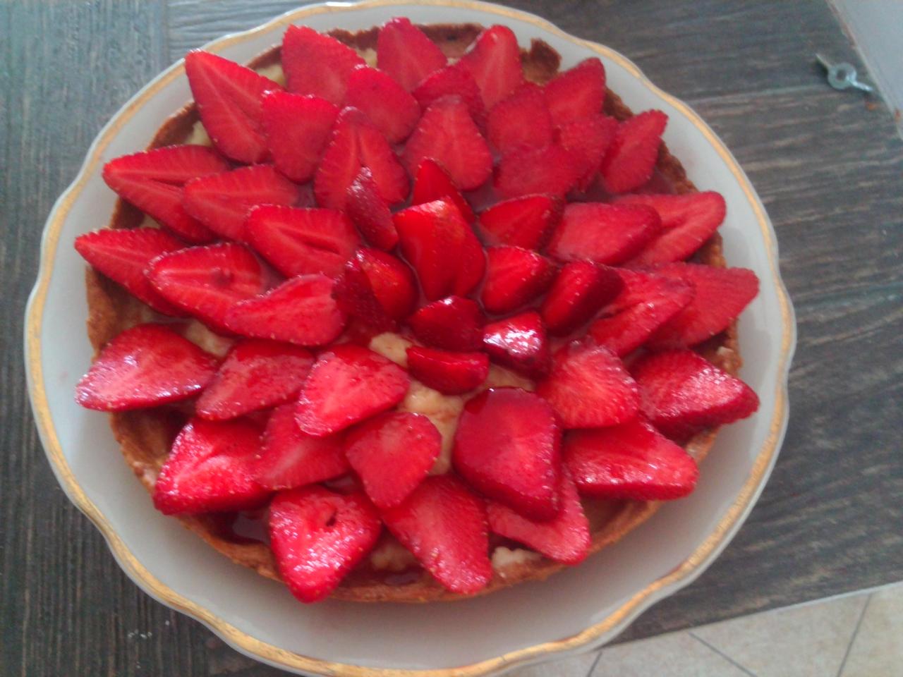 За это время из 1 ст. молока + 1 яйцо + 1 ст.л муки/крахмала + 2 ст.л сахара завариваю заварной крем. Молоко до кипения довожу в микре, потом вливаю яичную смесь и до загустения довожу в микре, помешивая каждые 1,5 минуты...так, в отличиии от плиты, он у меня не подгораетИли Олин от эклеров на 1/4 л молока пересчитываю. Есть время - могу сразу нанести на тарт и допечь еще 10-15 минут, нет - просто намазываю идаю подостыть, потом раскладываю клубнику и заливаю желе, Откеровским, по пропорции...