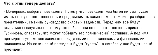 Наконец-то все вокруг (рассудительные, естественно. дебилы - не в счёт) перестанут истерически крича обговаривать детали руководства страной политиками, которых типа никто не выбирал. Ну и наконец, россии хошь-не-хошь придётся смириться. Именно срыва выборов стараются добиться те, кто бегает с оружием на востоке....