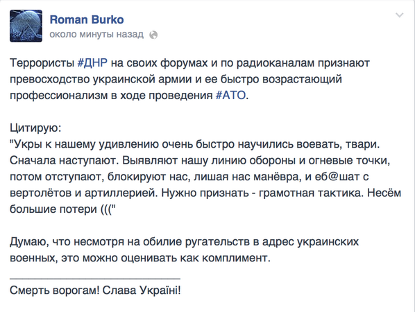 «Интересная информация об уровне профессиональной подготовки противника. Как сообщает российский журнал „Спецназ“, в бою за аэропорт Донецка украинские войска уничтожили одного из наиболее опасных террористов Донецкой народной республики — российского наёмника Сергея Ждановича. Жданович — ветеран Афганистана и Чечни, который совсем недавно был одним из инструктором в Центре специального назначения ФСБ РФ. Это элитная воинская часть».