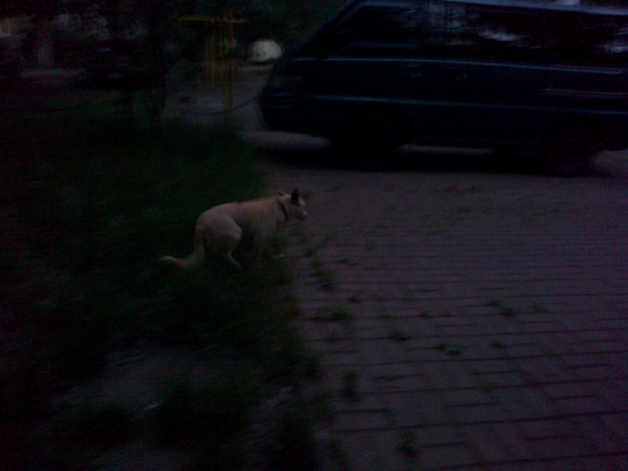 Фото получилось плохо, так как собака уже очень боится людей, и старается сразу уходить(еду ей на расстоянии даю) У нее снова перебита лапа, на которую он совсем не становится. Кстати, на фото та самая машина живодера...