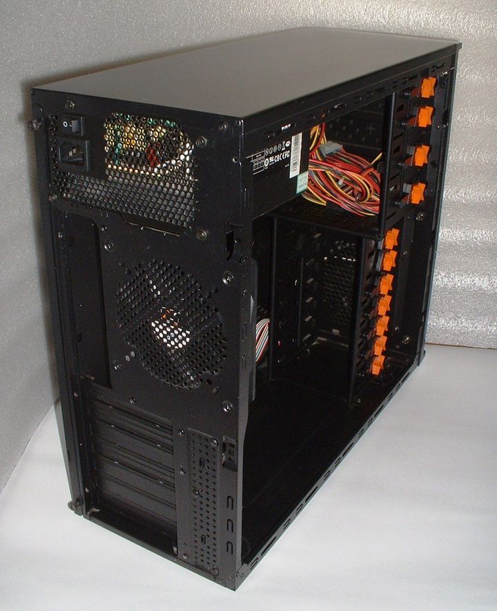 Корпус полностью прокрашен, имеет возможность безвинтового крепления PCI устройств и устройств 5,25"/3,5".