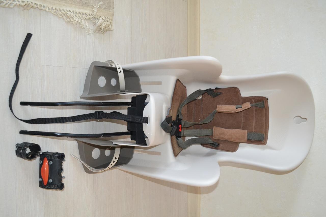 Детское велокресло с креплением за раму под седлом. Оснащено 5-точечным ремнем безопасности, имеет регулировки высоты защитных подставок для ног (12 позиций), угла наклона и положения велокресла.